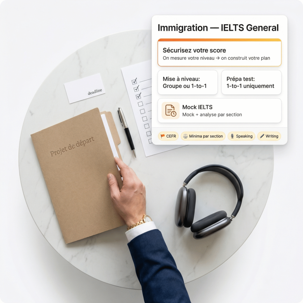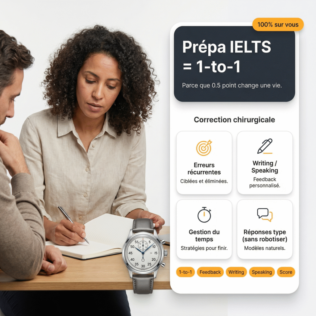 Imaginez. Le dossier est parfait. L’expérience pro est là. Mais le score Speaking ou Writing est juste un demi-point trop bas. Tout s’arrête. Des mois d’attente perdus. Des opportunités qui s’envolent. Nous ne laissons pas cela arriver. En One-to-One, nous éliminons l’échec point par point.