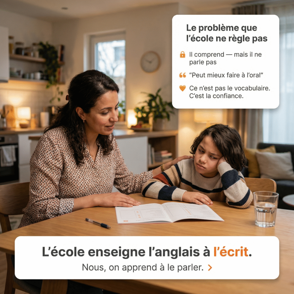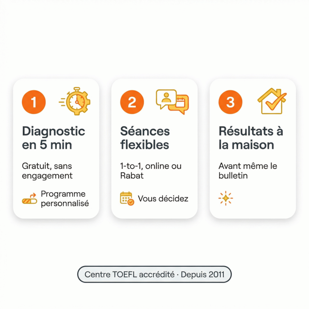Étape 1 — La démo gratuite. Votre enfant fait une séance avec un de nos coachs — en ligne ou à Rabat. On évalue son vrai niveau de communication, pas ses notes scolaires. Vous observez. Zéro engagement.
