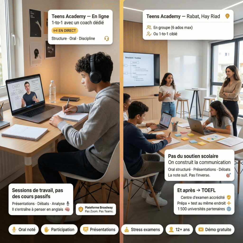 À partir du collège, le problème change. L’oral est noté. La participation compte dans le bulletin. Les présentations devant la classe deviennent un cauchemar. Et le stress des examens s’installe — bac, admissions, TOEFL plus tard. La Teens Academy attaque tout ça : communication orale, structure académique, discipline de travail en anglais. On ne fait pas du soutien scolaire — on construit un ado qui sait s’exprimer, organiser ses idées, et défendre un point de vue en anglais.