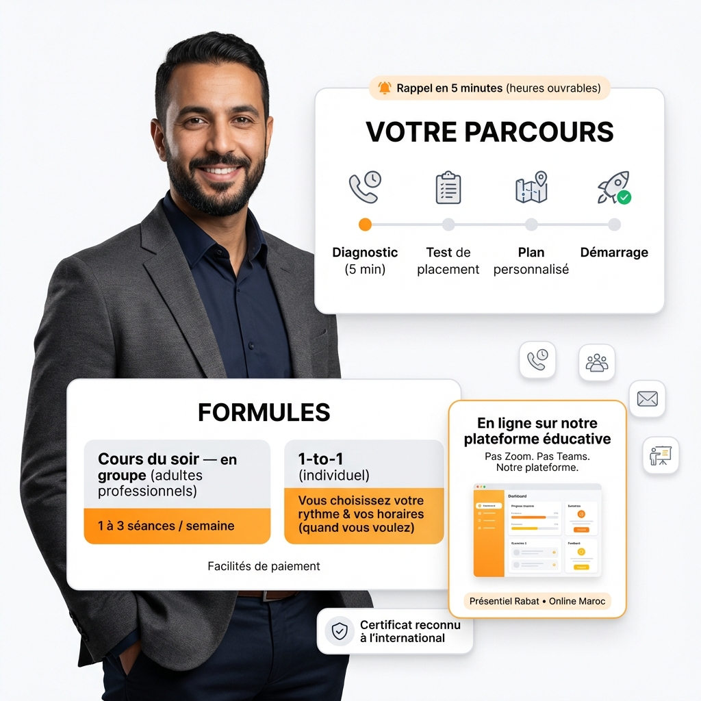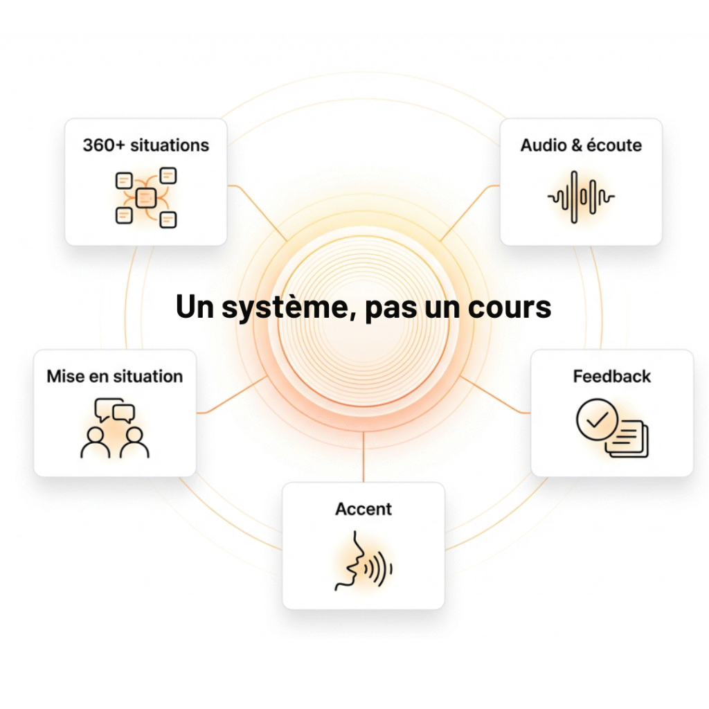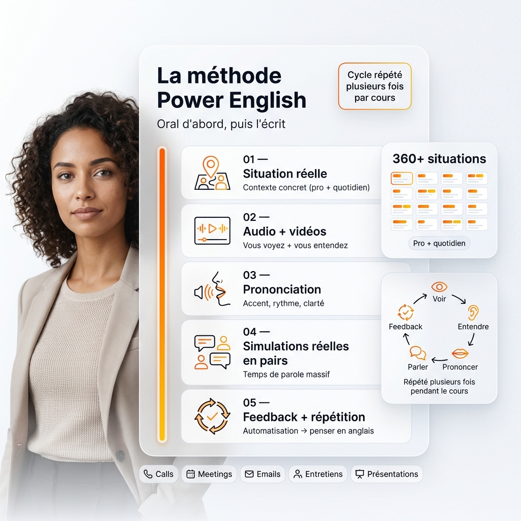On ne vous apprend pas des règles à réciter. On vous entraîne dans des simulations réelles (pro + quotidien), jusqu’à ce que vous pensiez en anglais et que vous répondiez sans bloquer.