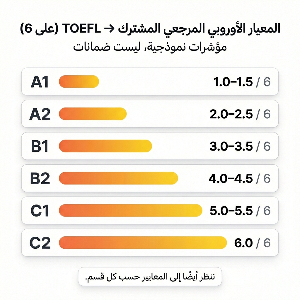 الـ TOEFL على 6 مرتبط بمستويات CEFR. كلما كان CEFR ديالك طالع، كلما كان السقف ديال السكور أعلى. هاد المؤشرات غير باش نحددو موقعك بسرعة. من بعد كنحسبو الاستراتيجية ديالك حسب كل Section. ⚠ الفخ اللي كيطيّح ملفات كثيرة: “Overall مزيان”…