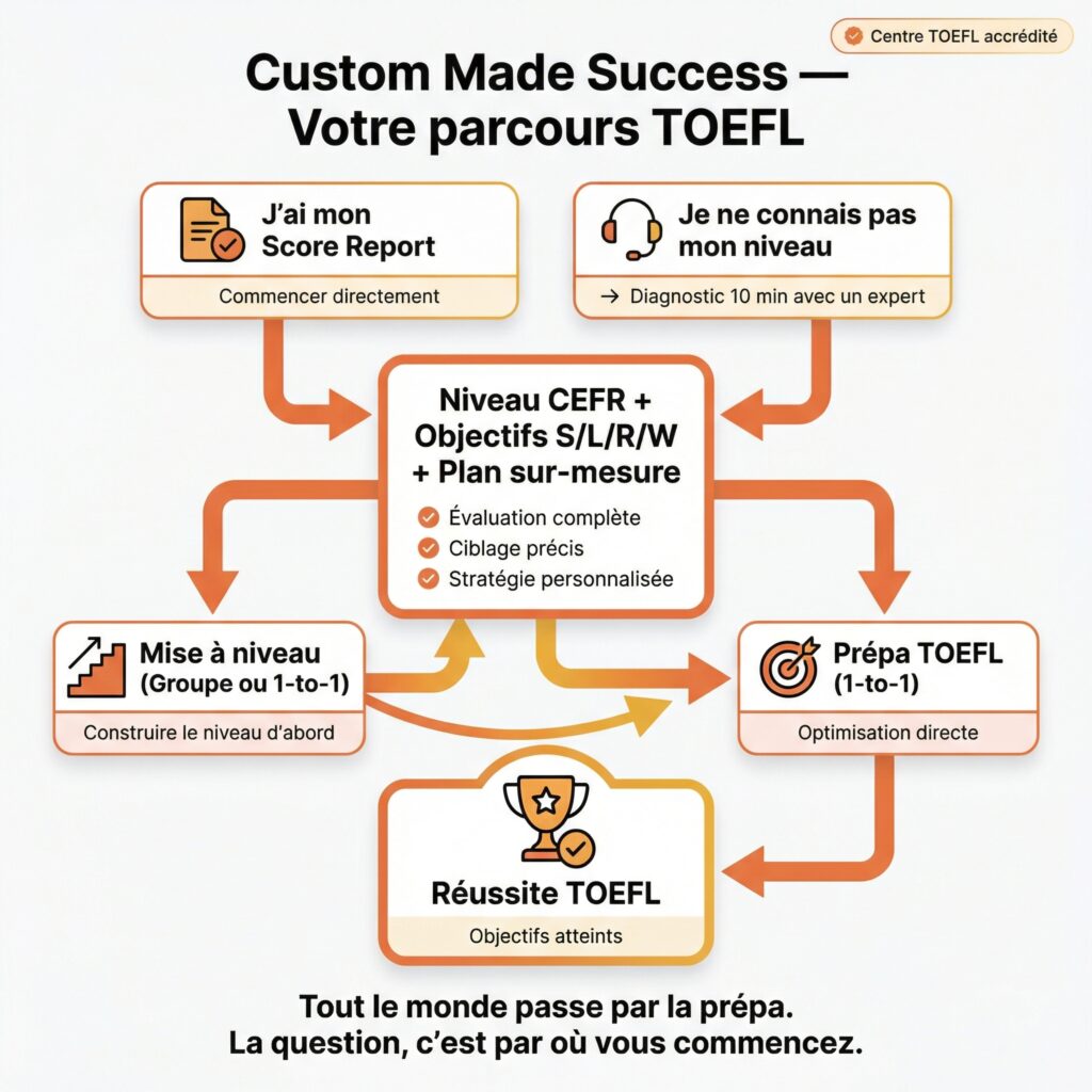 • Que vous ayez déjà un score report ou aucune idée de votre niveau, on part de là où vous êtes. Un diagnostic de 10 minutes avec l’un de nos experts suffit à cartographier vos forces, vos lacunes et votre deadline. Ensuite, on construit : mise à niveau si le niveau manque, prépa chirurgicale quand il est là. Chaque parcours passe par la prépa TOEFL 1-to-1 — parce que c’est là que le score se joue. Pas de pack générique. Pas de devinette. Un plan, un objectif, un résultat.