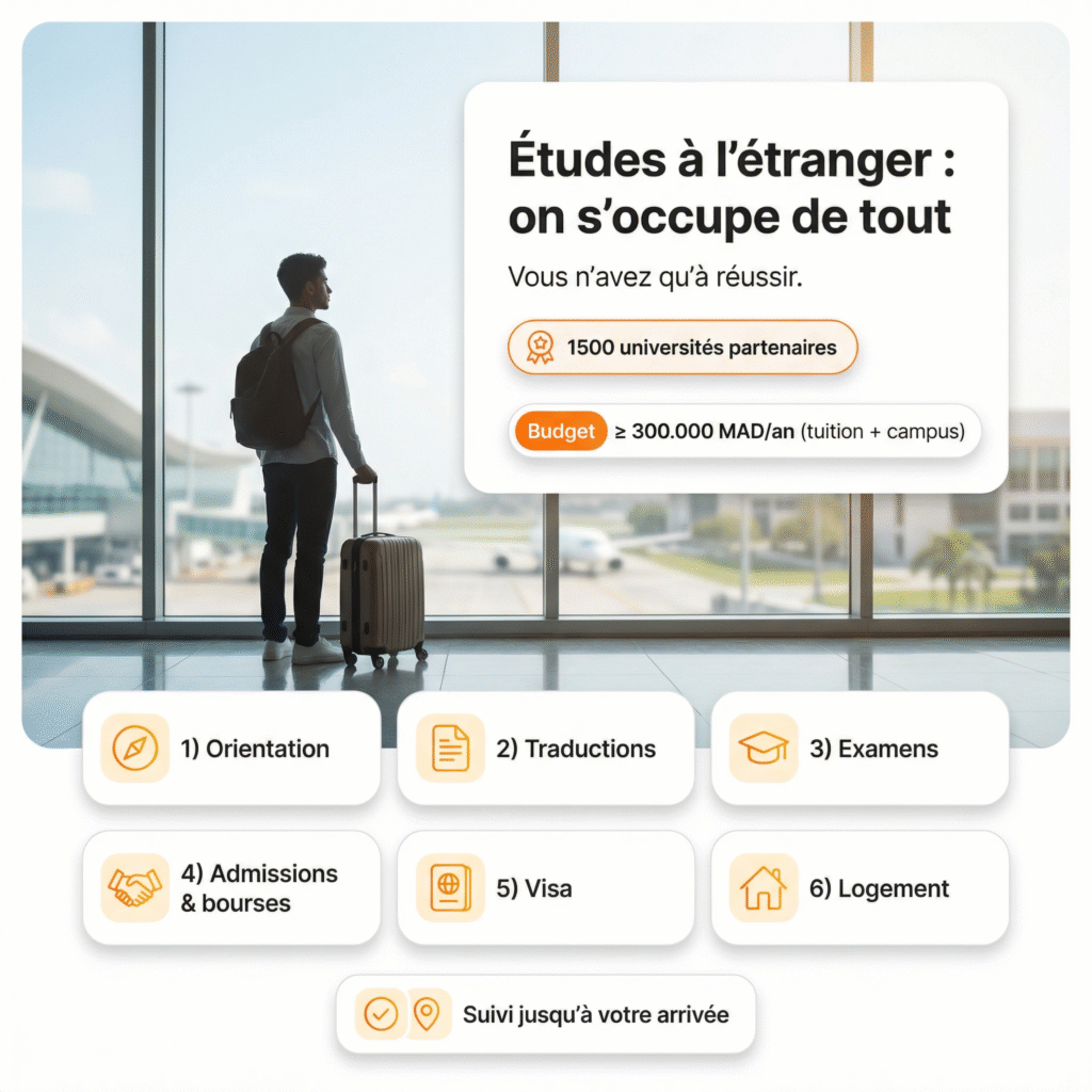 Si vous avez un budget ≥ 300.000 MAD/an (tuition + campus), Broadway vous accompagne de A à Z grâce à notre réseau de 1500 universités partenaires : orientation, traductions, examens (IELTS/TOEFL/SAT/GMAT), admissions & bourses, visa, logement — avec un suivi jusqu’à votre arrivée.