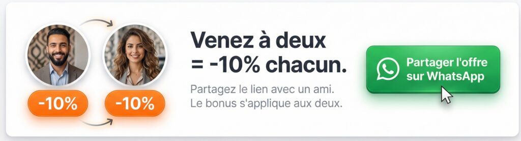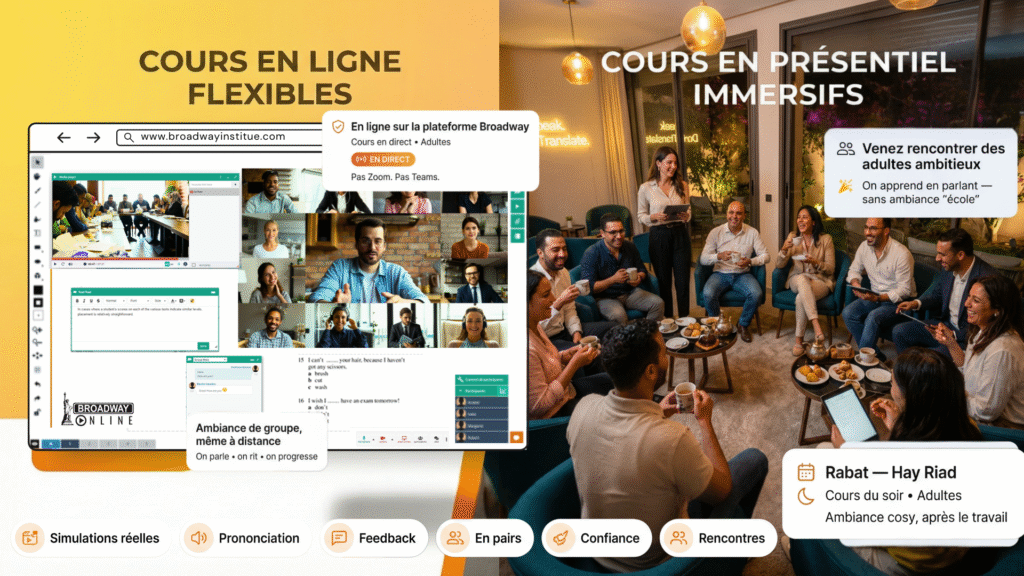 Vous ne cherchez pas “un cours”. Vous cherchez une expérience qui vous fait parler pour de vrai. Ici, vous venez après le travail: ambiance cosy, adultes motivés, échanges, rires… et surtout une méthode qui transforme vos réflexes.