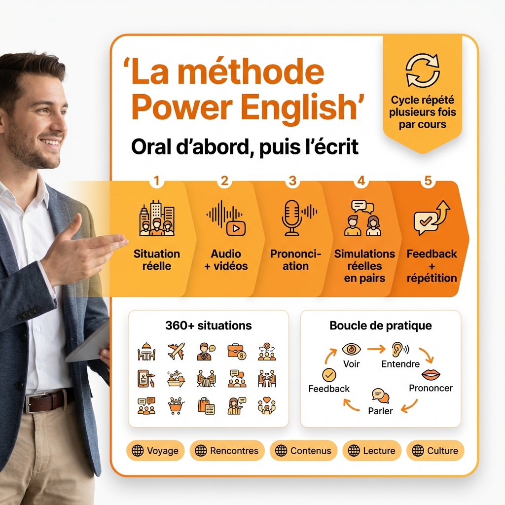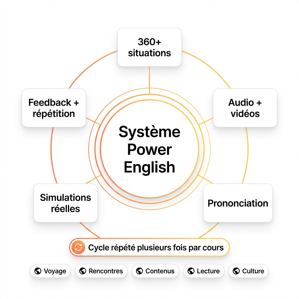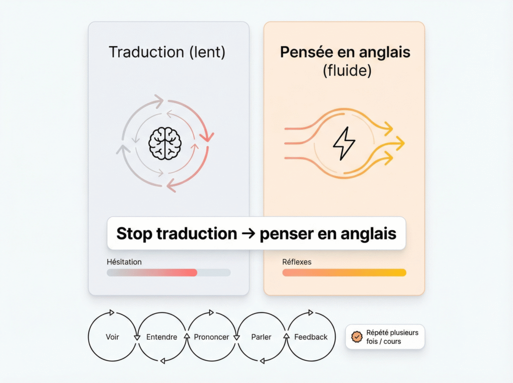 Vous connaissez des mots… puis au moment de parler, votre cerveau passe par le français, vous cherchez, vous doutez, vous perdez la fluidité. Notre méthode casse ce circuit: vous vivez la situation, vous l’entendez, vous la dites — jusqu’à penser en anglais.